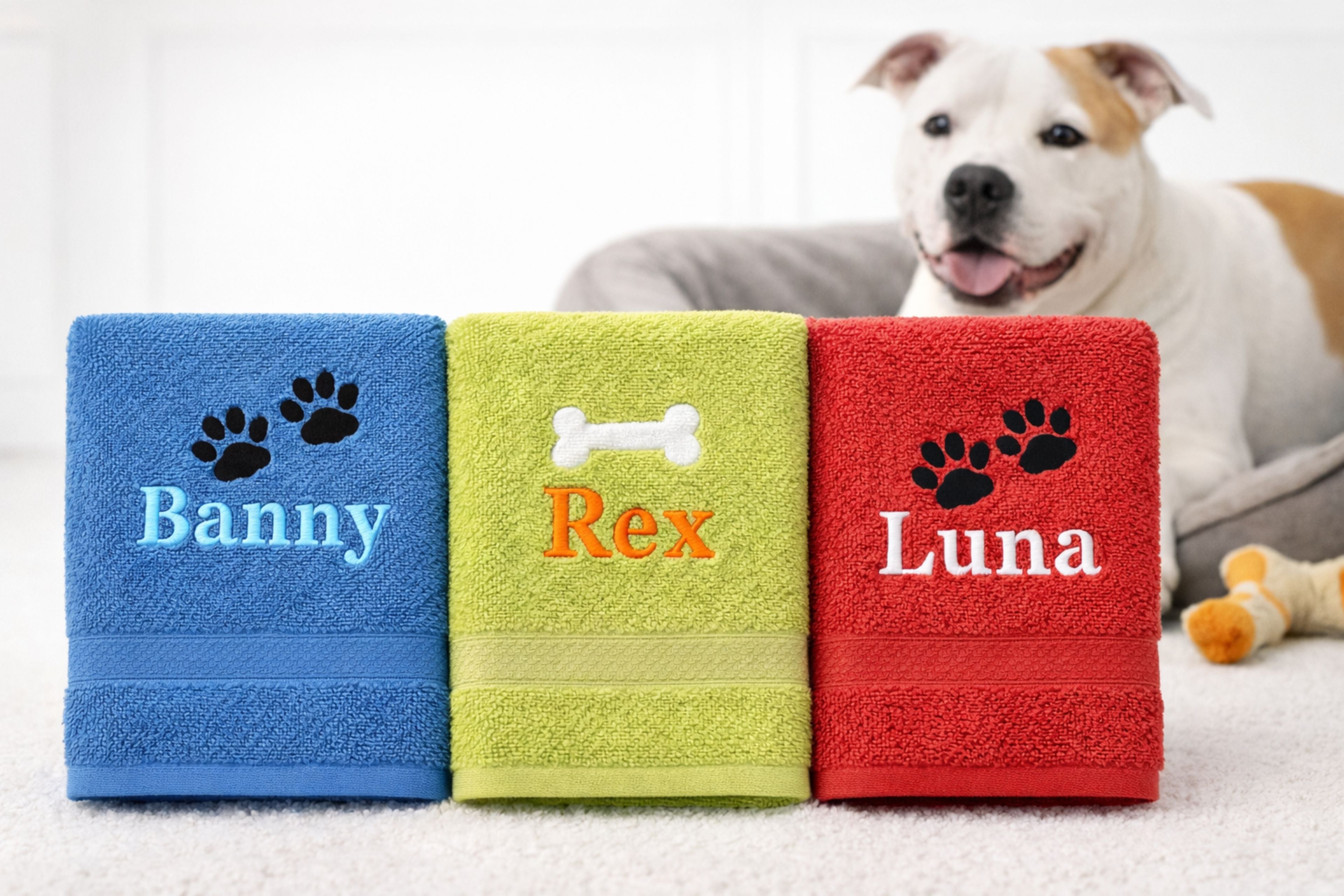Custom embroidery for pet accessories, personalised with names and unique designs. Thoughtfully embroidered on blankets, towels, and everyday essentials for your furry friends.